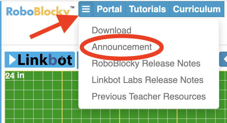 Note: This page can be accessed using the "three bar" menu (also called a "hamburger" menu) at the top left of RoboBlocky after you sign-in:
