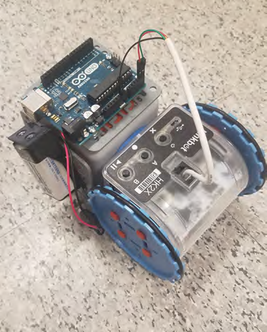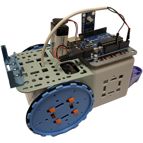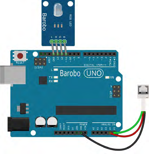 The R, G, and B pins on the LED module plug into digital pins 13, 12, and 11, respectively, on the Arduino, as shown in the first image below. The LED - (ground) pin plugs into the GND pin next to pin 13. The image also shows how the green, red, and black wires from the white cable connector plug into the A5, A4, and GND pins, respectively. The other end of the white cable plugs into the top of the Linkbot (as shown in the second image below, without the LED module installed).