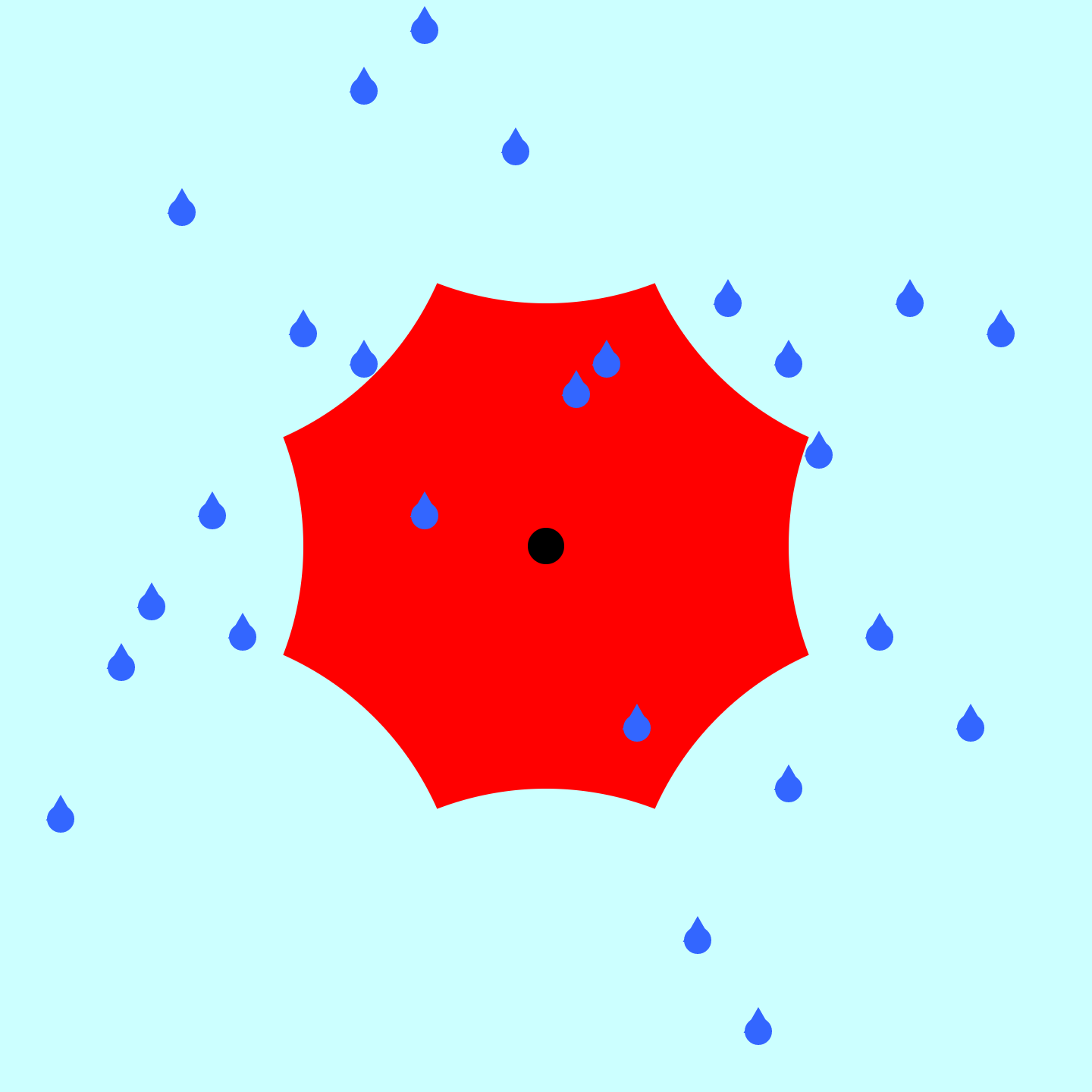 The pre-placed blocks draw a funny looking umbrella. Fix the x and y variables in the loop and the count block so that the umbrella created has 8 vertices and 8 sides of equal size, as shown in the initial prompt. You will need to change the values inside the cos and sin functions, and the number of times the program loops. You also need to add 25 raindrops in random locations. Do this using a loop. |