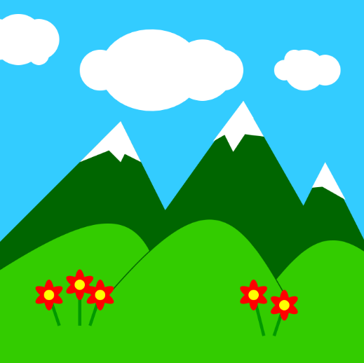 The pre-placed blocks set the background color and draw a mountain. Add more blocks to draw a scene with mountains and hills like that shown above. Use Bezier curves to draw the hills. Clouds and flowers can be drawn using overlapping circles or ellipses. |