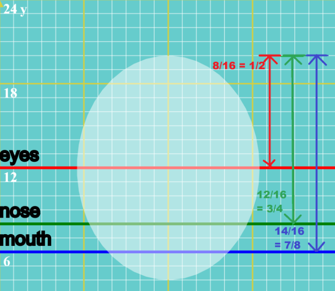 The pre-placed blocks will draw the ellipse to provide the shape of the face. Add more blocks to draw features at the appropriate locations. The eyes will be circles that are located on the red line, which is located halfway down the face. The bottom of the nose will touch the green line, 3/4 of the way down the face. The bottom of the smile will touch the mouth line, 7/8 of the way down the face. |