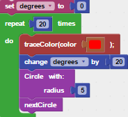 The Circle() and nextCircle() blocks create a circle of a given radius and take the robot to the next starting point for the next circle. The changeDegrees() blocks change the degrees needed to move the robot to the next starting point. For this activity, you will need to modify the given blocks to complete the twenty circles shown on the board.