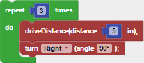 The above driveDistance() block drives the robot forward 5 units. The turnRight() allows the robot to move a certain number of degrees from the x-axis. The degrees can be modified by changing the block next to "angle". The while() block allows the student to loop the program a set number of times. For this activity, you will need to modify the given blocks to complete the parallelogram shapes shown on the board.