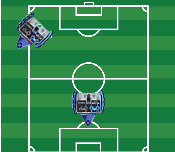 The pre-placed blocks draw a ball and move two robots. Add blocks to animate the ball to act as if it is being kicked when the robots touch it, and score a goal. |