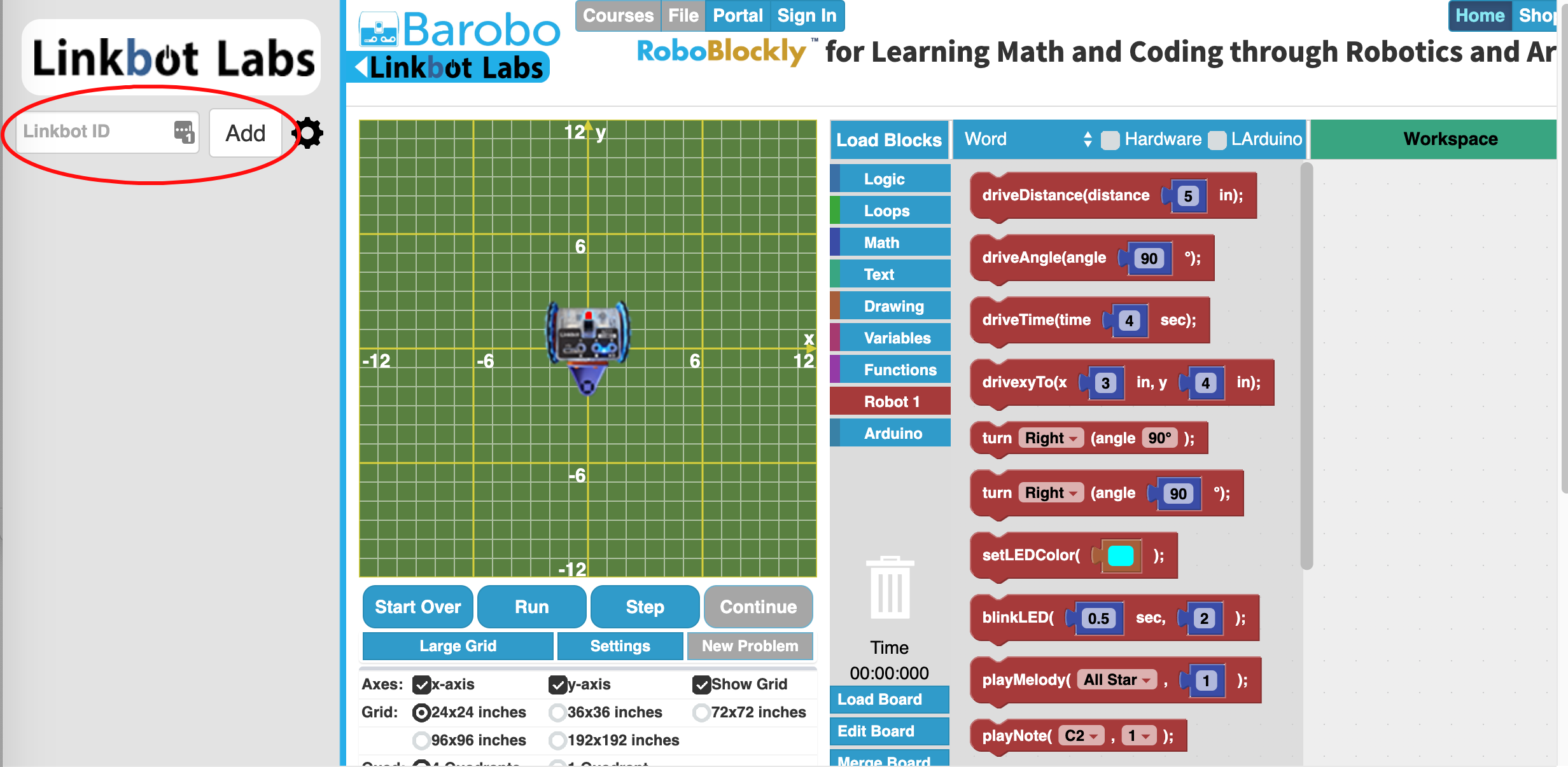 Figure 2: RoboBlocky user interface with the Linkbot Labs sidebar open. Enter the ID for a Linkbot in the box (circled in red) and click the “Add” button.